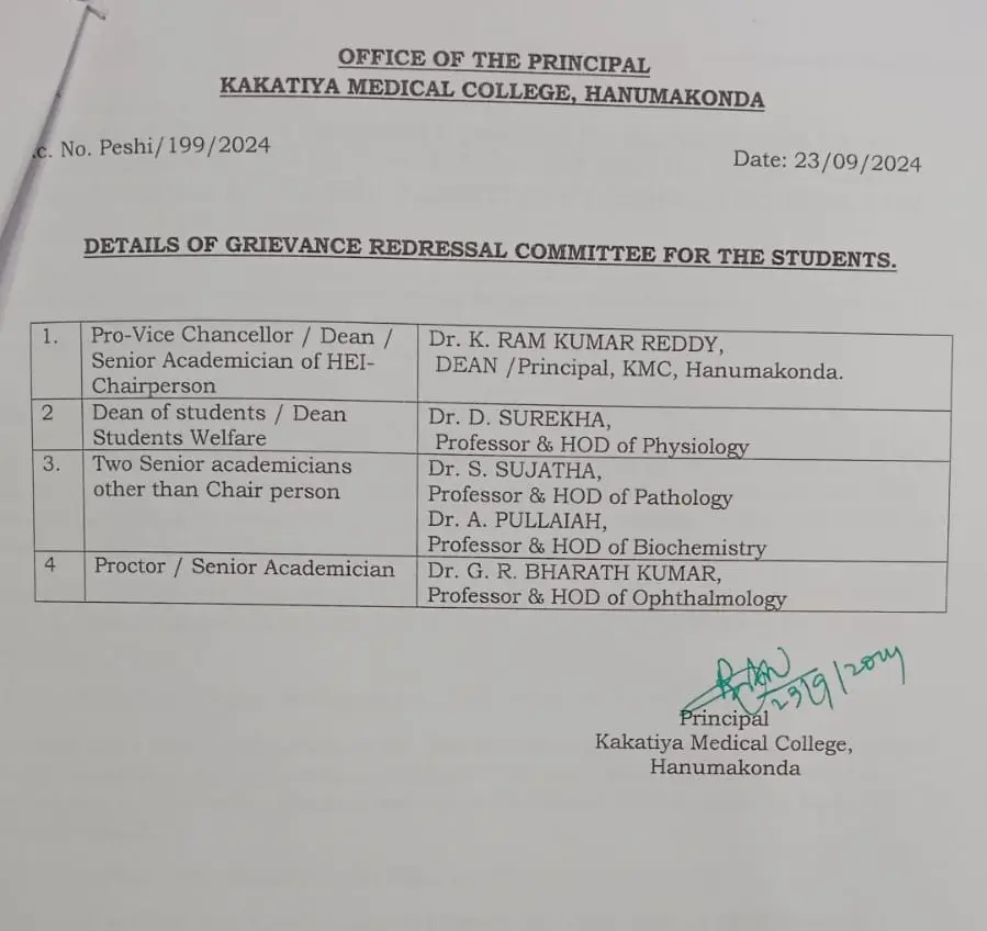 DEATILS OF GRIEVANCE REDRESSAL COMMITTEE FOR THE STUDENTS