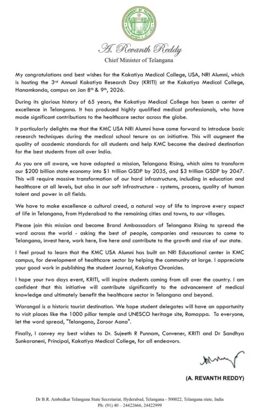 అలాగే తెలంగాణ రాష్ట్ర గౌరవ ముఖ్యమంత్రి రేవంత్ రెడ్డి KRITI 3.0 విజయవంతం కావాలని శుభాకాంక్షలు తెలియజేస్తూ, ఆరోగ్య సేవలు, వైద్య విద్య, పరిశోధన రంగాల్లో కాకతీయ మెడికల్ కాలేజ్కు ఉన్న , ఖ్యాతిని ప్రశంసించినట్లు తెలిపారు. ఆయన సందేశం విద్యార్థులు మరియు అధ్యాపకుల్లో మరింత ఉత్సాహాన్ని నింపిందన్నారు.